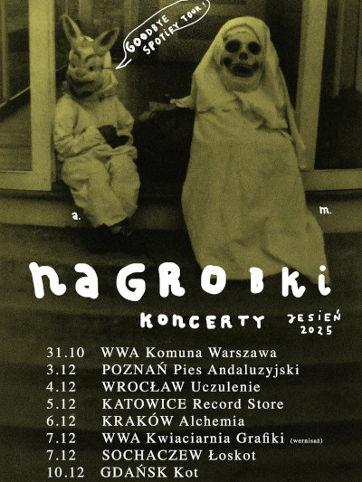 Może mam osobliwe poczucie humoru, ale Nagrobki nie przestają mnie rozbawiać. Przez zapowiadający trasę filmik, w którym Adam Witkowski o koncercie we Wrocławiu mówił, pokazując zdjęcie z podpisem "Monachium", prawie się popłakałem ze śmiechu. Czy sprawdzi się wygłoszona w tym samym nagraniu przez perkusistę zapowiedź, że pogoda będzie fajna, mało mnie obchodziło. Wystarczy mi, że jest to zespół jednej trafnej prognozy: że wszyscy umrzemy.